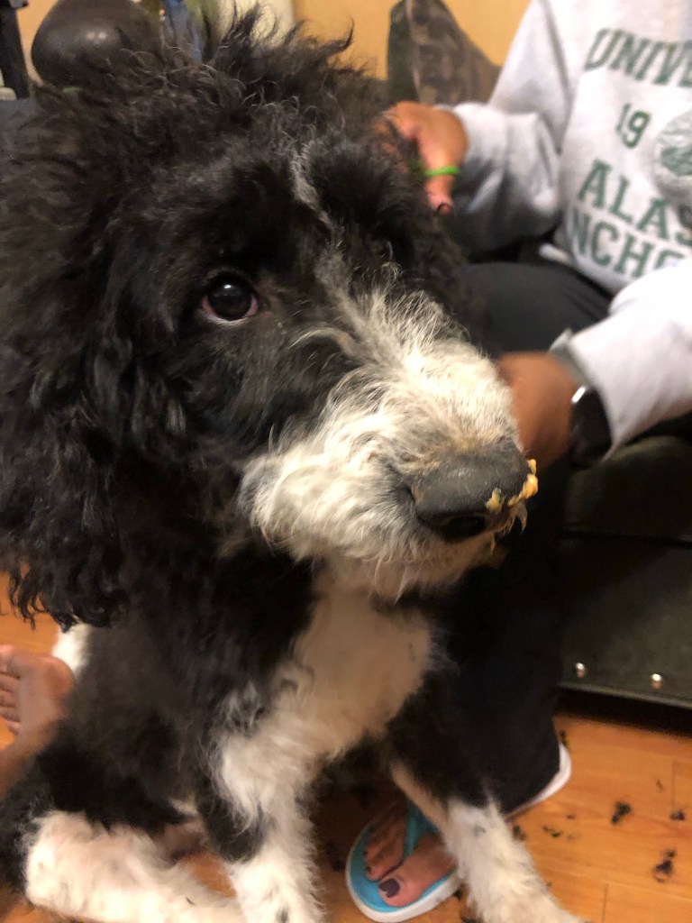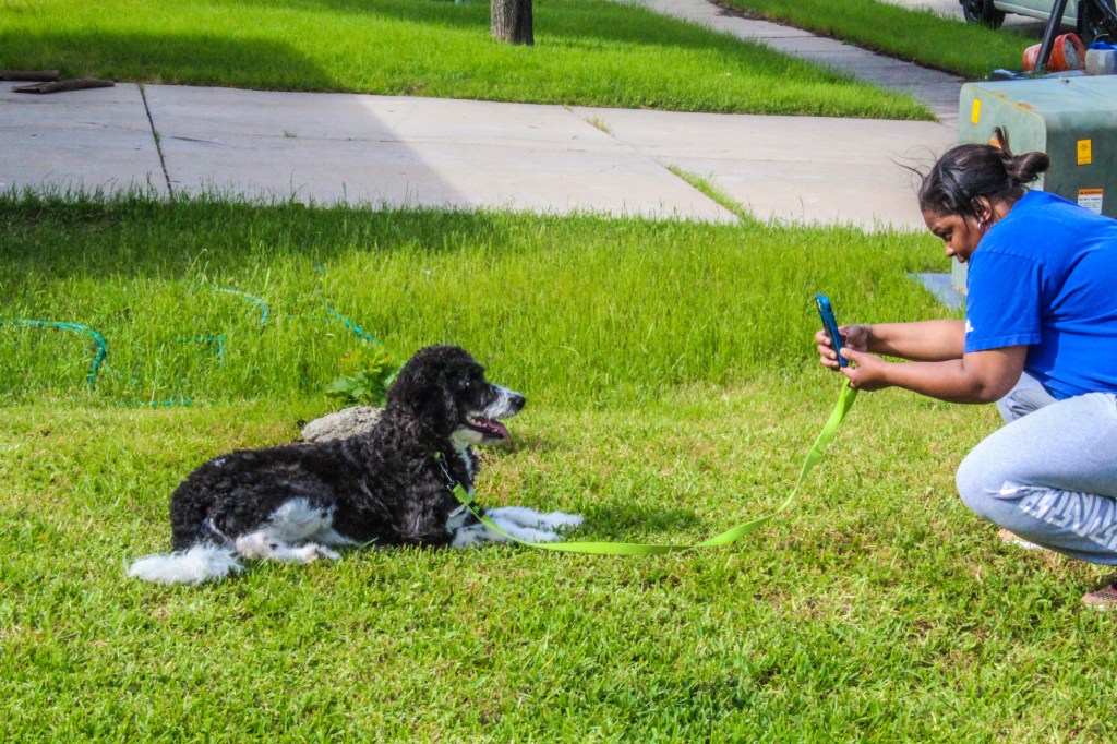 This is a picture of my mom cutting my dogs hair. We had to give him peanut butter so he would stay still.