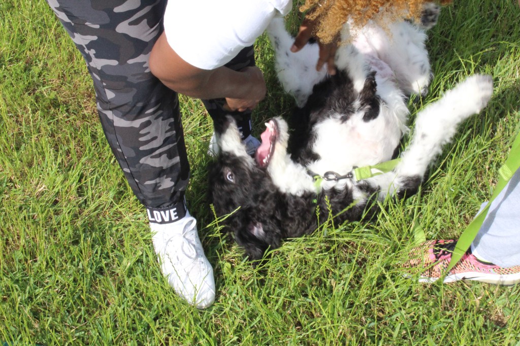 This is his first time meeting our neighbors.after laying in the grass he was full of those sticker things.
